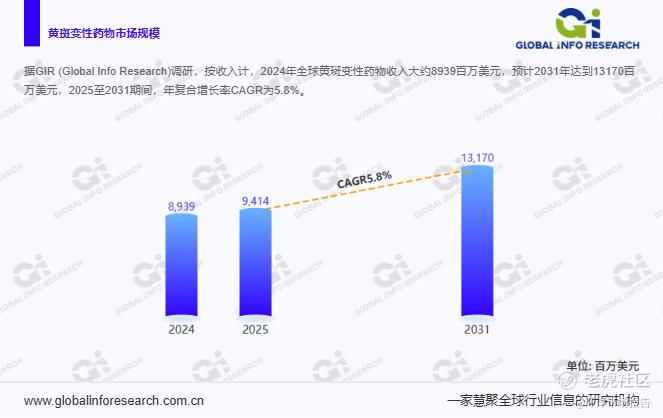 根据 Global Info Research(环洋市场咨询)发布的调研报告,从收入维度来看,2024 年全球黄斑变性药物市场收入已达到约 8939 百万美元。随着全球人口老龄化加剧(老年人群是黄斑变性高发群体)、人们对眼部健康重视程度提升以及疾病早期诊断率提高,对黄斑变性药物的治疗需求持续增加;同时,药物研发技术进步,新型药物在疗效与安全性上不断优化,进一步推动市场规模扩张。预测数据显示,到 2031 年,全球黄斑变性药物市场收入有望增长至 13170 百万美元,在 2025 至 2031 年期间,市场年复合增长率(CAGR)将保持在 5.8%,增速显著,展现出强劲的增长动力与广阔的市场潜力。