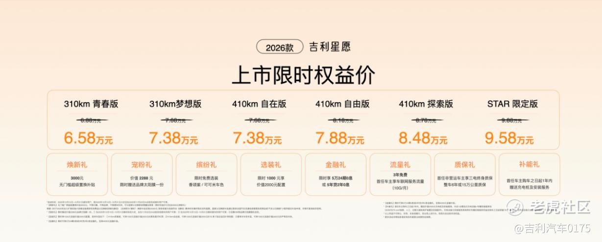 2026款吉利星愿上市限时权益价为6.58万元–9.58万元。同时为回馈用户支持,同步推出八重限时购车权益,包括焕新礼、宠粉礼、缤纷礼、选装礼、金融礼、流量礼、质保礼、补能礼,进一步降低拥车门槛,提升用车体验。