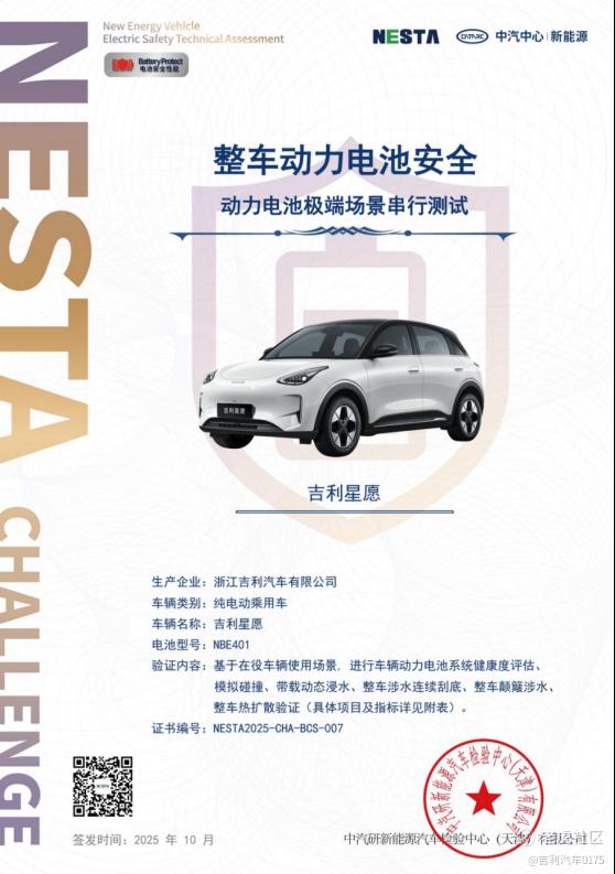 除了电驱,星愿的电池也足够硬核与可靠。星愿以同级领先的充电效率,电量从30%-80%仅需21分钟。通过全系液冷的电池热管理技术,即使在零下30度到55度都能即停即充。在广泛受关注的电池寿命方面,星愿的电池寿命验证标准提升至国标的2倍。国标要求循环验证500次后电池容量不低于90%,而星愿在完成2倍于国标要求的1000次循环后,容量仍达到90.72%,甚至用开了8.4万公里的星愿,还能成功挑战6大串行极限测试,其中包括海水腐蚀、泥水冲刷、三高区域的连续充放电、烂路刮底、甚至极限的外部火烧等场景,完成行业首创。