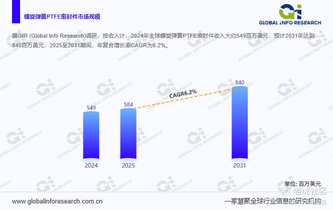据 Global Info Research(环洋市场咨询)调研数据显示,按收入计算,2024 年全球螺旋弹簧 PTFE 密封件市场收入约为 549 百万美元,对应全球销量达 8200 万件,平均售价为 6.5 美元 / 件。从未来发展趋势来看,预计到 2031 年,市场收入将增长至 840 百万美元,在 2025 至 2031 年期间,市场年复合增长率(CAGR)将保持在 6.2%,呈现稳健增长态势。此次调研统计维度跨越 11 年行业数据,历史数据覆盖 2020 至 2024 年,预测数据延伸至 2025 至 2031 年,涵盖全球及主要地区规模、厂商产品特性、价格、销量与市场份额等核心指标,为行业研究提供全面支撑。本次报告由广州环洋市场信息咨询有限公司出版。