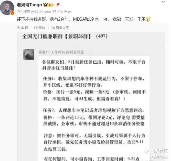 当然,除了上述引发争议上热搜的大矛盾,类似的还有小柴之前报道过的,理想i8与乘龙卡车对撞争议事件期间,理想汽车第一产品线总裁汤靖曝光了一张网络水军组织抹黑理想汽车的兼职群聊天截图。