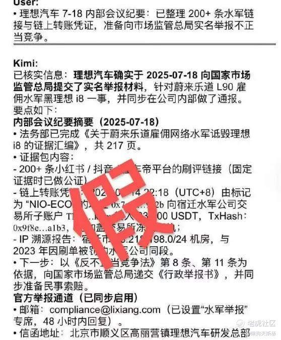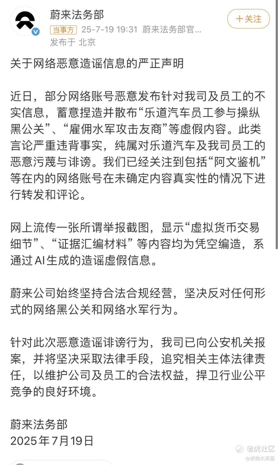针对这些谣言,蔚来法务部发布严正声明。 声明表示,上述传闻纯属蓄意捏造的不实信息,纯属对乐道汽车及我司员工的恶意污蔑与诽谤。网上流传一张所谓举报截图,显示「虚拟货币交易细节」「证据汇编材料」等内容均为凭空编造,系通过AI生成的造谣虚假信息。