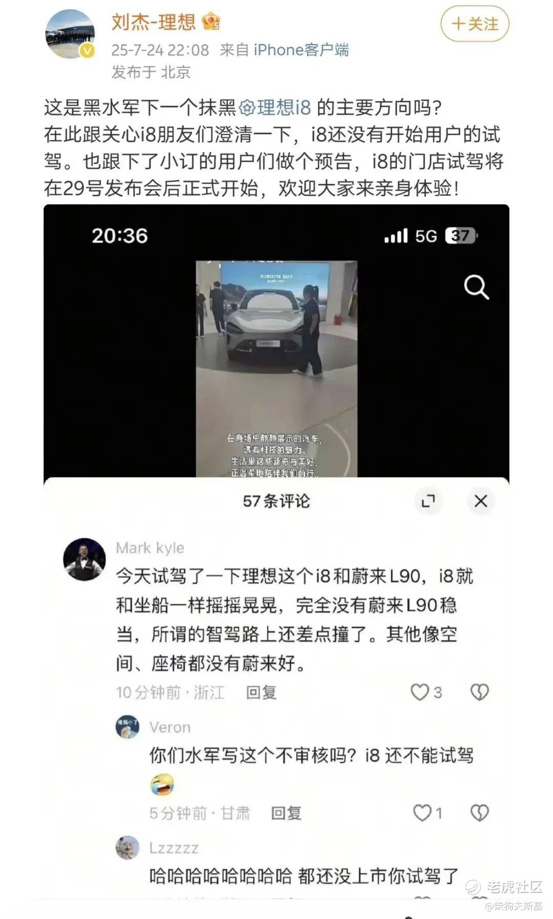 同样的7月份,理想i8当时还没正式开放试驾,但是网上出现了试驾理想的负面评论,随后,理想高管怒了,发文表示,这是黑水军下一个抹黑理想的主要方向吗?