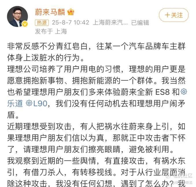 随后,蔚来品牌与传播助理副总裁马麟发文表示,非常反感不分青红皂白,往某一个汽车品牌车主群体身上泼脏水的行为。并建议理想汽车报警。