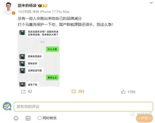 对于这段聊天内容,杨波则发文称:“总有一些人会跳出来给自己的品牌减分,打个马赛克保护一下你,国产新能源路还很长,别这么急! ”
