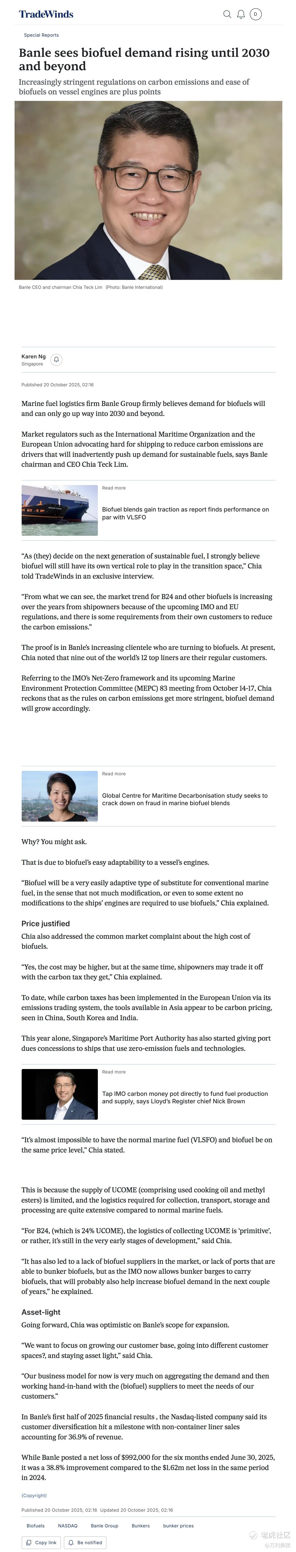 ✅ 监管驱动强劲:随着国际海事组织(IMO)“净零”框架及欧盟碳排放法规日益严格,以B24为代表的生物燃料正加速获得主流船东青睐。