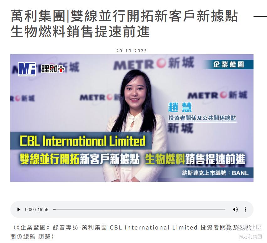 在全球航运业迈向低碳合规新时代的背景下,CBL International Limited(纳斯达克股票代码:BANL,万利集团旗下上市实体)荣幸接受新城财经台《企业蓝图》专访!