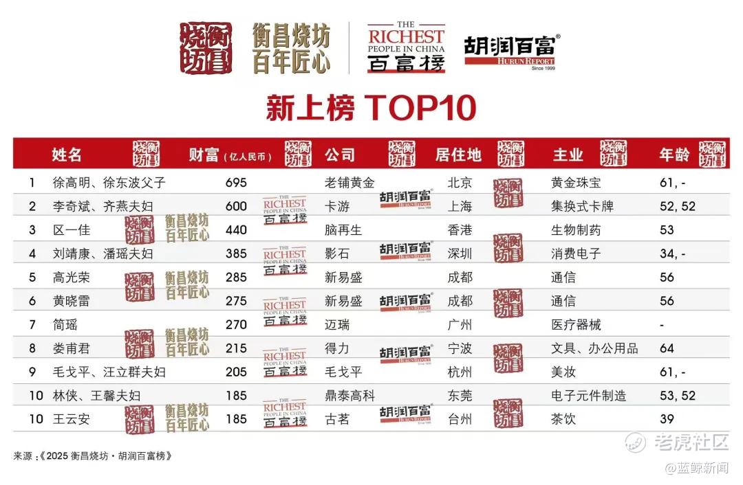 新上榜的376位富豪中,居于首位的是老铺黄金的徐高明、徐东波父子,其以695亿元财富跻身百富榜前100。老铺黄金绝对是今年消费领域最具话题度的企业之一。日前,老铺黄金刚刚完成年内第三次调价,多款产品涨幅超20%。调价前一日,老铺线下门店排队之势颇为壮观,其中新开业的上海恒隆广场店当天凌晨2:30时排队人数已达接待上限。