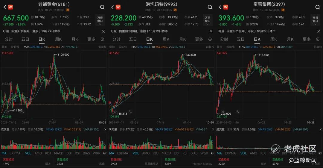 热潮席卷到资本市场。今年上半年新消费板块表现十分抢眼,蜜雪集团、老铺黄金和泡泡玛特的股票一度涨幅惊人,年内最高涨幅分别高达205%、361%和277%。不过创下历史高点后,新消费巨头们的股价均经历了大幅回撤,部分跌幅超30%。