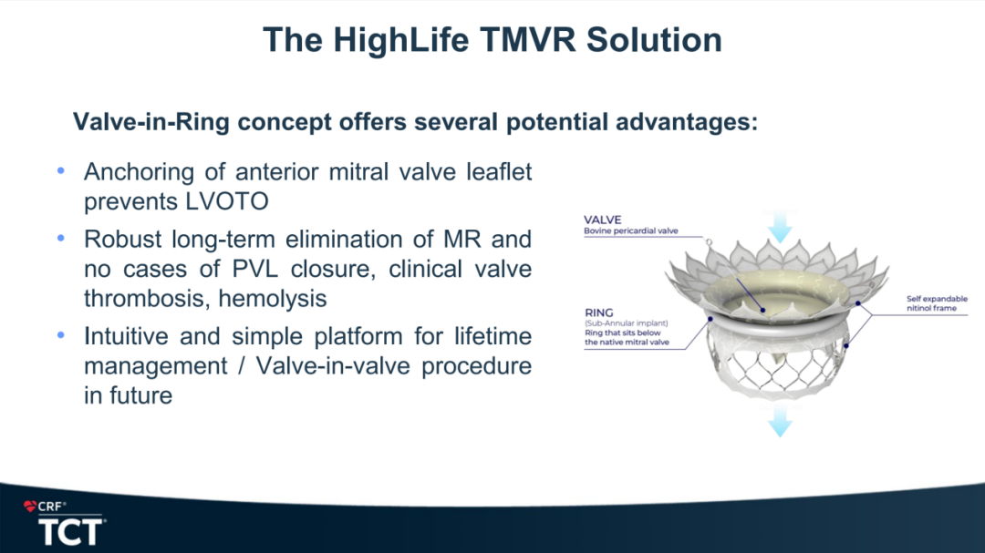 HighLife TSMVR系统采用特有的“Valve-in-Ring”设计理念,利用固定环与人工瓣膜实现非径向支撑力锚定,Clarity版本瓣膜显著减小了左室流出道梗阻风险。此项TSMVR技术可持久而稳定地减少反流,瓣周漏发生率极低且无需封堵,无瓣膜血栓和溶血。有利于直观且简单地进行全生命周期管理,未来可进行瓣中瓣置换术(valve in valve)。