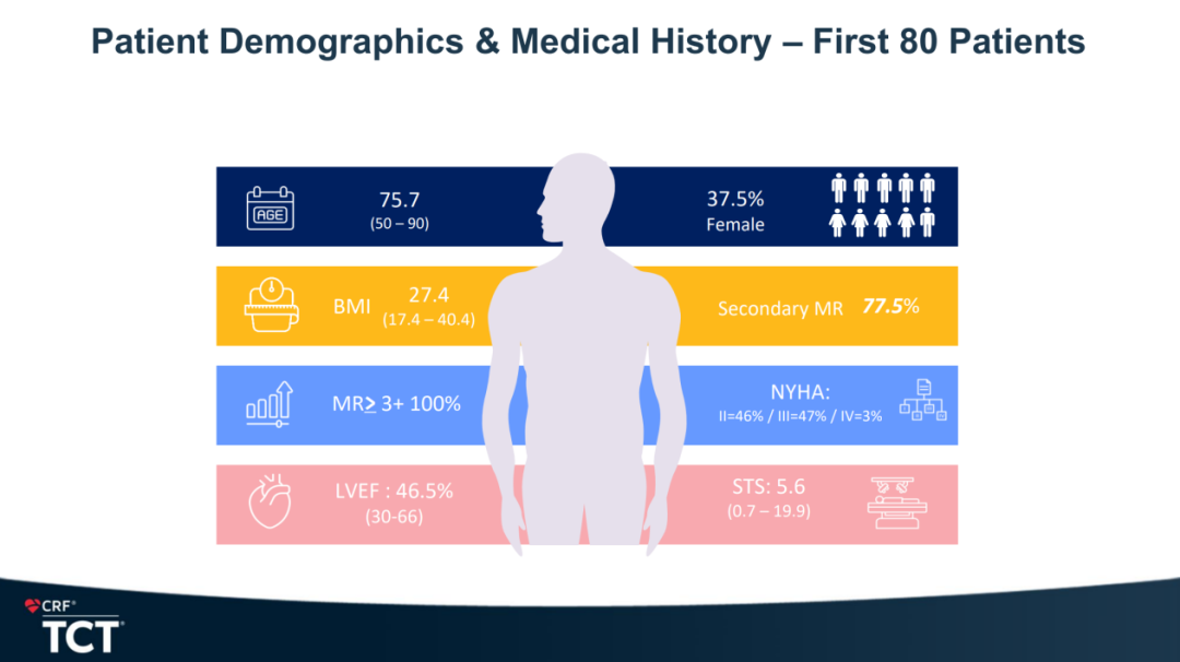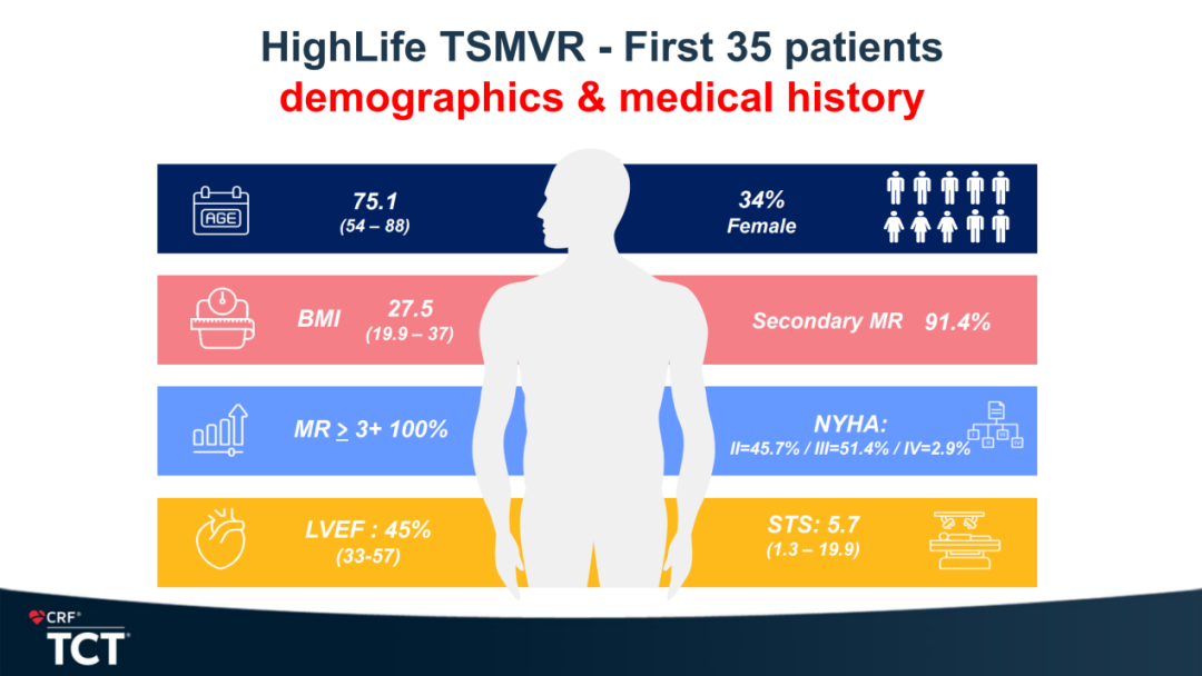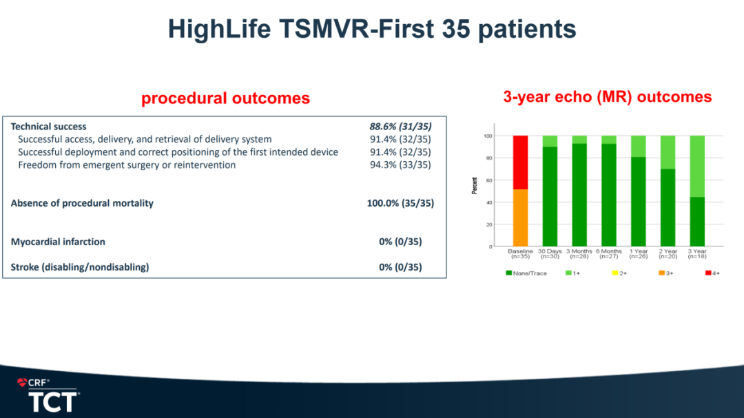 本次大会公布HighLife TSMVR Feasibility Study前35例患者3年结果,患者平均年龄为75.1岁,34%为女性,SMR占比91.4%,所有患者MR≥3+,所有患者NYHA分级II级以上,平均LVEF 45%,STS评分5.7。