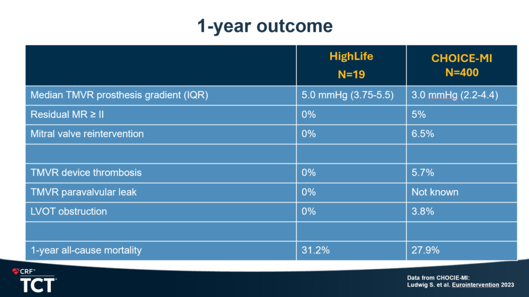 CHOICE-MI Registry评估了全球范围内接受经导管二尖瓣置换疗法患者的临床随访结果,纳入31家中心,入组400例接受二尖瓣置换的患者,二尖瓣置换器械多达11种。Mirjam Kessler教授选用本中心19例使用HighLife的患者和CHOICE-MI Registry 中400例患者进行对比分析。以CHOICE-MI的数据作为基准参照,结果显示HighLife TSMVR在手术相关表现,30天不良事件,和1年结局方面表现相似,且都实现了优秀的反流消除效果。