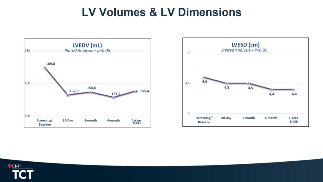 与此同时,Thomos E. Waggoner教授也发表了HighLife TSMVR单中心左室逆重构结果,进一步辅证了Wolfgang Rottbauer教授的HighLife TSMVR术后可实现左室逆重构的观点。MR患者在长期的病程中容易出现左室重构,表现为左室扩张,室壁变薄,左室球形等,这些表现会带来不良预后。而左室的逆重构可以降低左室容量,恢复左室良好的几何形态,增加心输出,可改善预后。Thomos教授统计了80例患者基线到1年时的跨瓣压差,左室每搏量(stroke volume),左室心输出(cardiac output),LVEF,左室容量如LVEDV,LVESV,LVESD,LVEDD等,NYHA分级,KCCQ及6分钟步行时间。结果表明,患者的左室容积和内径有显著降低,尤其是LVEDV从基线169ml降低到30天时152ml,且持续稳定至1年随访。他提到这种左室逆重构与HighLife术后增加了每搏量和心输出,提升生活质量,但又不降低LVEF相关。并且强调,HighLife尊重原生瓣叶和腱索等解剖结构,最大程度上保留了腱索的应力,这些应力可以抵抗LV扩大,改善LV几何形态。同时血流动力学的改善可以降低心衰的发生,以上是HighLife TSMVR促进左室逆重构的原因。