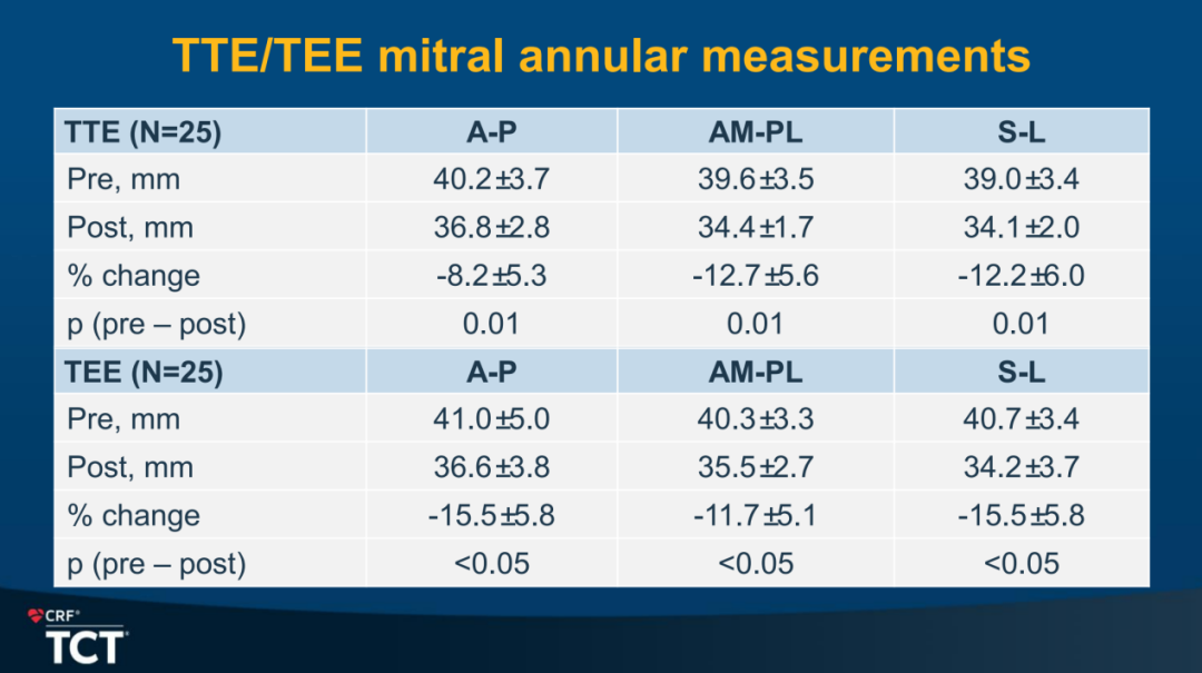 对FMR患者来讲,术后缩环效应往往预示着更好的临床结局,既往经导管缘对缘修复疗法TEER的相关研究已表明由于瓣叶对合长度的增加,TEER可实现缩环效应。既往大多数TSMVR器械依靠oversizing实现锚定,并没有展示出较好的缩环效应。HighLife基于Valve in Ring的设计理念,并不依赖径向力支撑,其缩环表现如何?