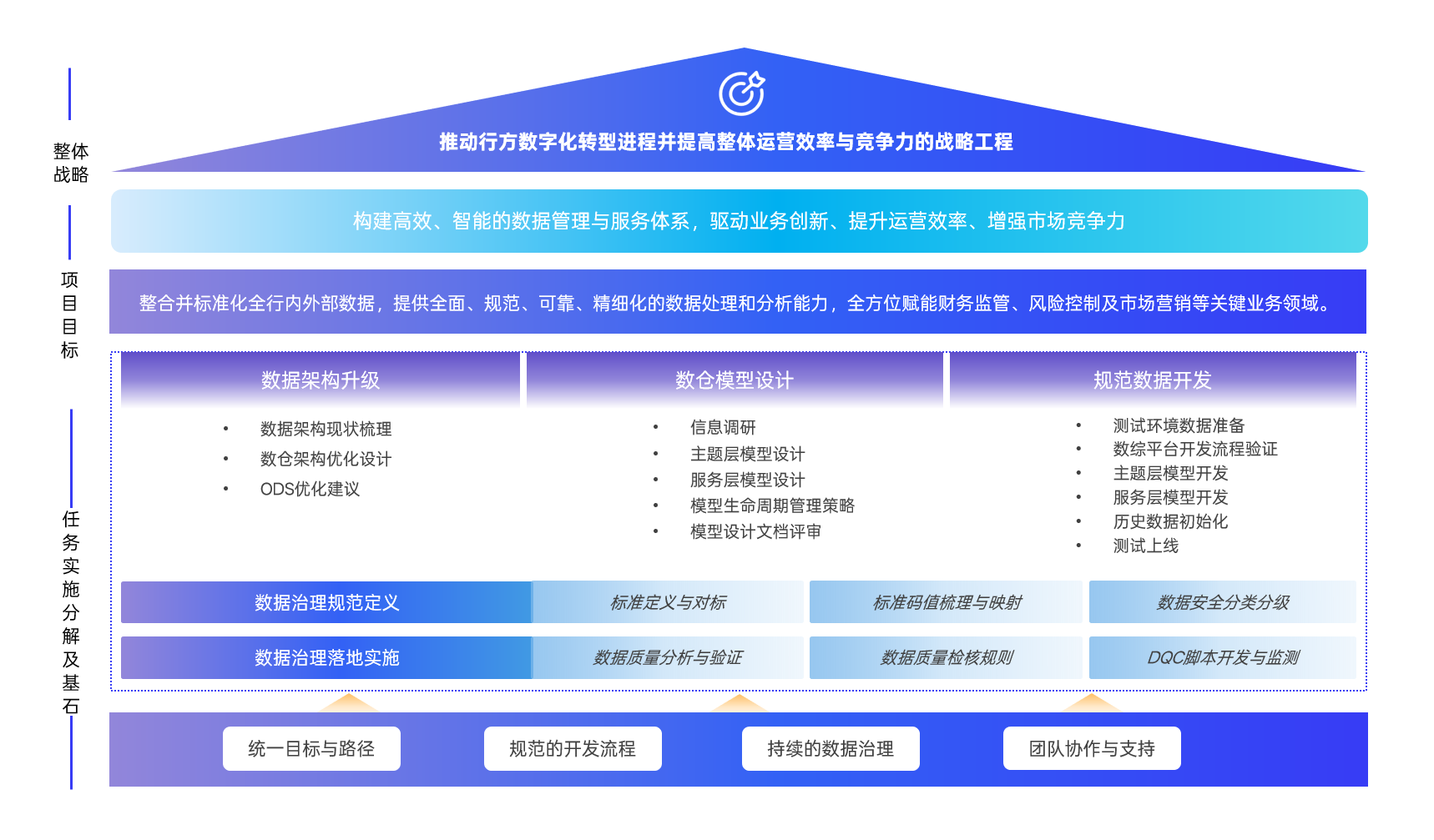 制定符合行方特色的数据架构,明确数据架构各分层功能定位、明确各层各区域数据之间的流转机制,制定数据架构的实施路径,明确数据架构不同分层的模型支撑应用服务场景的原则。