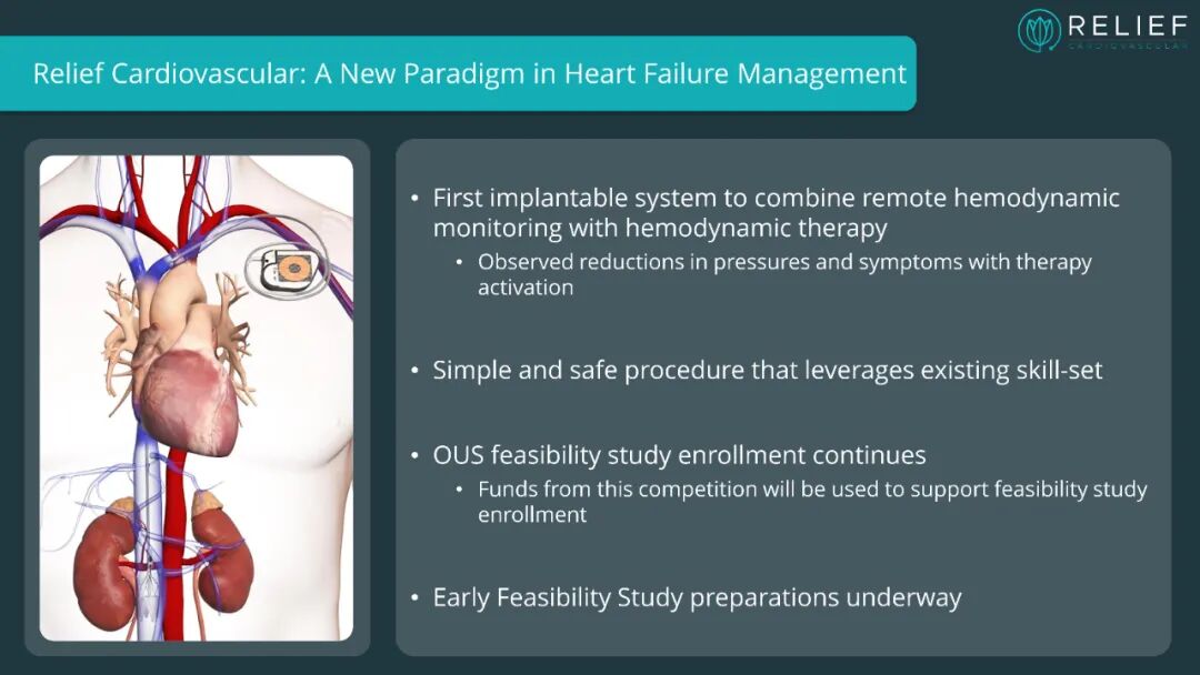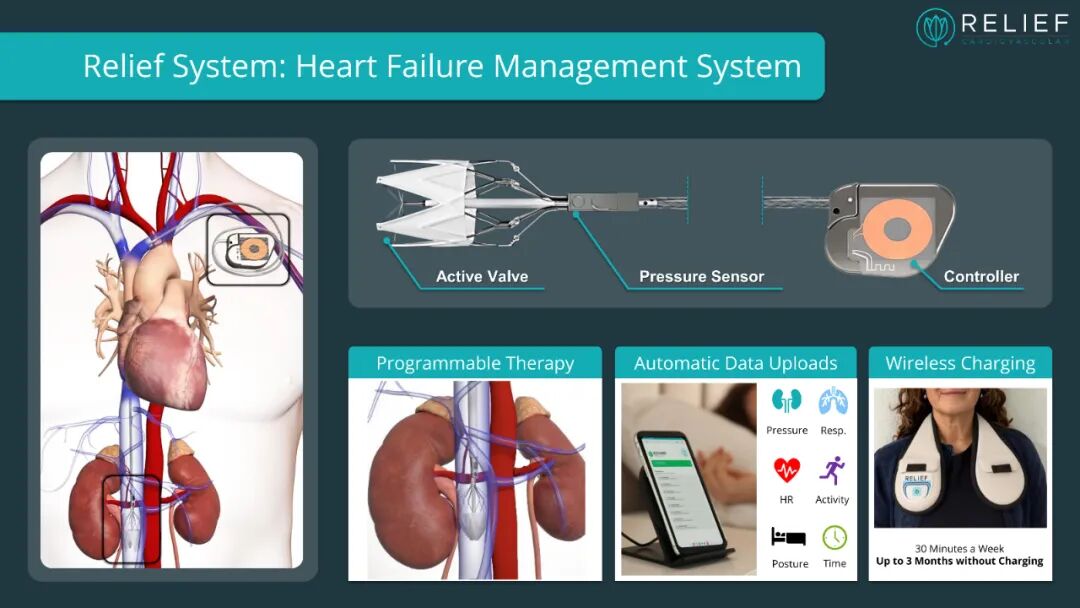 Relief系统的核心特点是在下腔静脉中植入一个压力引导的主动阀门,该阀门旨在动态降低心脏前负荷并增强肾静脉血流。此项技术将血流动力学监测与自适应的血流动力学治疗整合到一个单一的经导管植入式系统中。