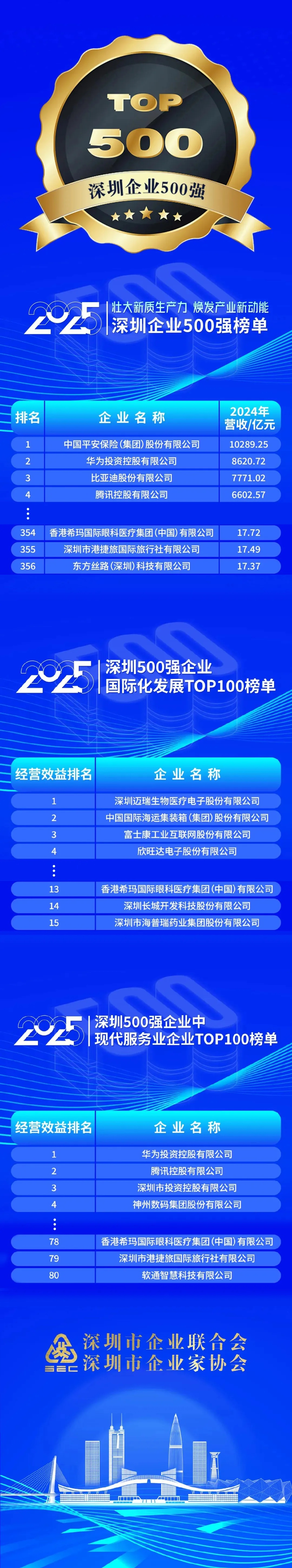 10月28日,深圳市企业联合会、深圳市企业家协会(简称深圳企联)正式发布“2025深圳企业500强榜单”及《2025深圳500强企业发展报告》。希玛医疗集团连续5年上榜“深圳企业500强榜单”,位列354名。同时,上榜“国际化发展TOP100榜单”和“现代服务业企业TOP100榜单”,分别位列13名与78名。