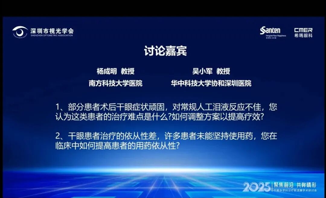在话题讨论环节,杨成明教授、吴小军教授围绕“术后难治性干眼的方案优化”与“患者用药依从性提升”两大临床痛点展开了多维度探讨,为一线临床医生提供了宝贵的实用参考,特别是在复杂病症的治疗中,如何优化干眼症的治疗方案和提升患者的用药依从性,从而提高治疗效果和患者生活质量。