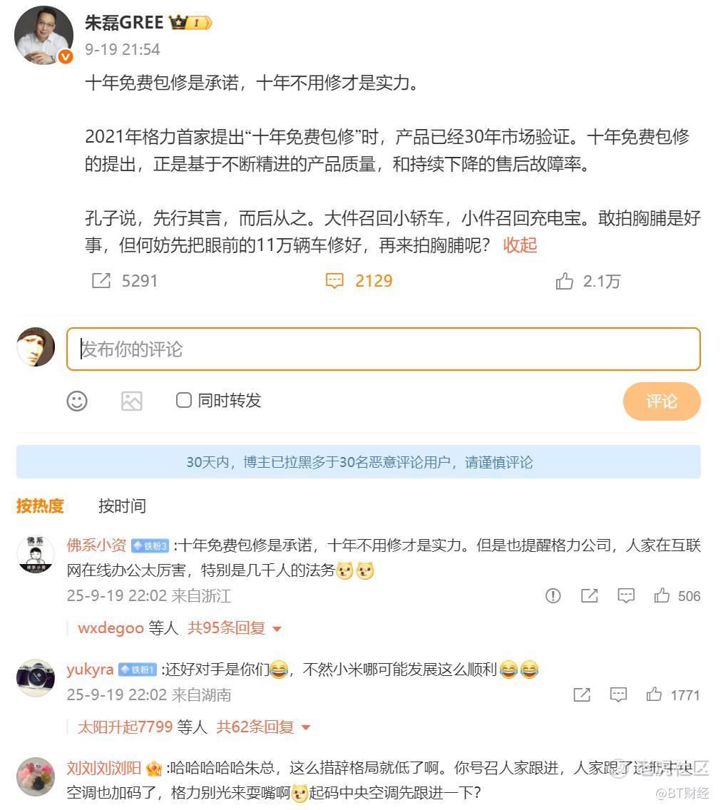 9月,小米宣布空调推出10年免费包修服务,格力高管朱磊发文嘲讽称:“大件召回小轿车,小件召回充电宝,敢拍胸脯是好事。先把眼前的11万辆车修好,再来拍胸脯呢?”或暗指小米此前召回11.6万辆SU7标准版电动汽车。被网友质疑情绪化回应,朱磊还强调“制造业是实干干出来的”,批评小米转发“似是而非的信息”。