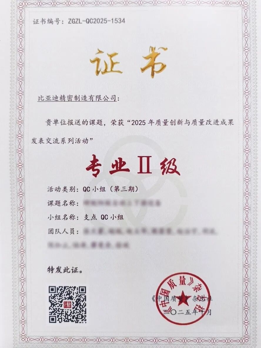 此次获奖是比亚迪电子长期深耕质量建设的必然结果,多年来,公司始终以质量及创新为核心竞争力,常态化开展质量月、QC等各类质量创新和质量改进类成果发表赛,通过案例分享交流,相互学习相互促进,将质量观念融入生产运营各个环节。