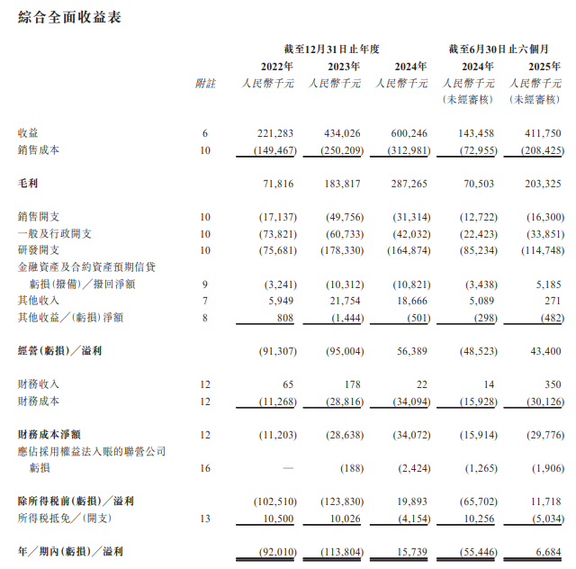 招股书显示,在过去的2022年、2023年、2024年和2025年前六个月,微亿智造的营业收入分别为人民币2.21亿、4.34亿、6.00亿和4.12亿元,相应的净利润分别为人民币-9,201.0万、-11,380.4万、1,573.9万和668.4万元。