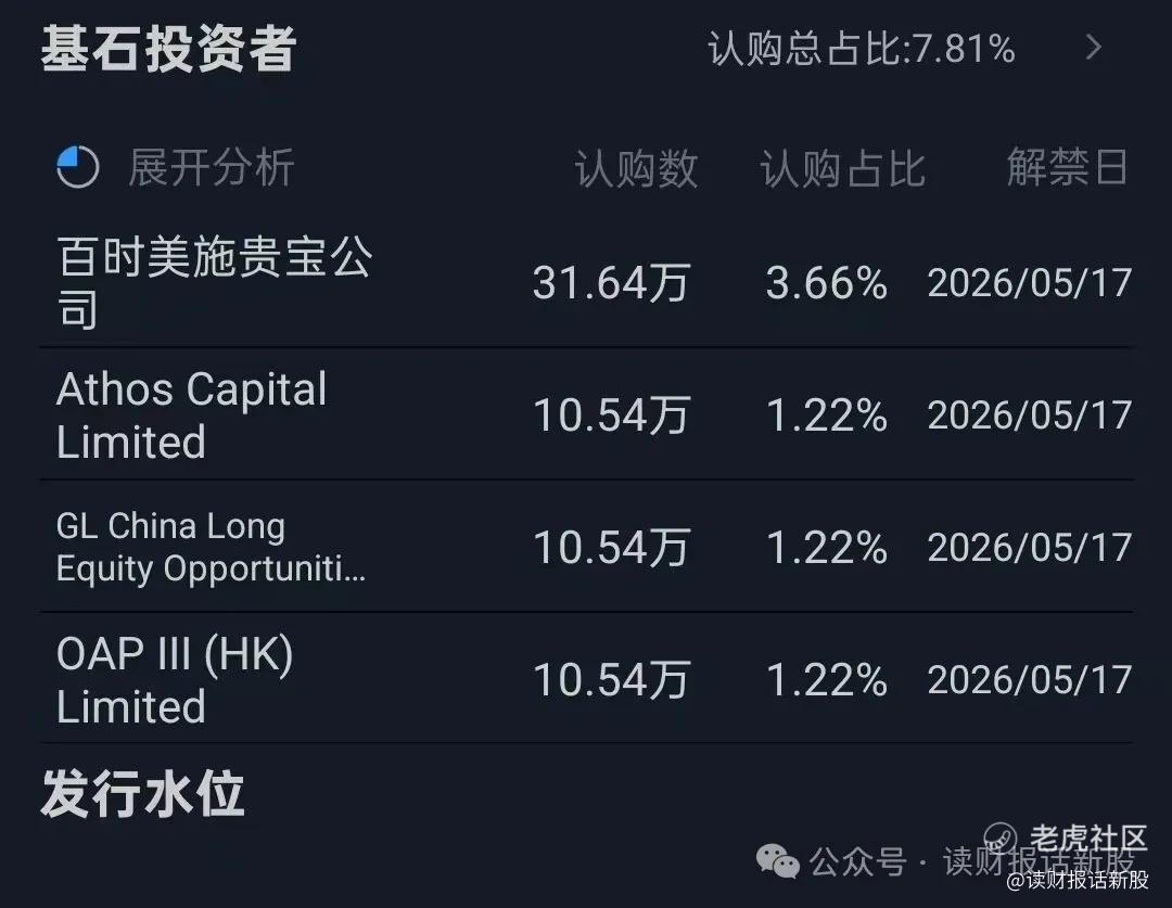 百利天恒 $百利天恒(02615)$ 的基石阵容,除了富国基金能打外,其他都是杂毛,且基石份额才不到8个点,说明了机构不太认可公司