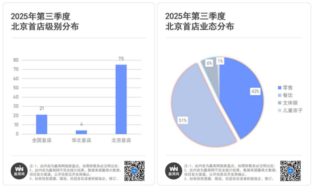 据赢商大数据不完全统计,2025年第三季度,北京开出约100家品质首店,远多于去年同期的66家和前年同期的51家。今年Q3每个月开业的首店数量几乎相同,7月33家、8月34家、9月33家,稳步快速上新。其中,从首店级别来看,包括21家全国首店、4家华北首店和75家北京首店,稀缺性高、业态多元性高、社交话题性高,实现数量与质量并重;标准店与非标准店的数量比为2:1,说明新晋首店的呈现方式愈发多元。