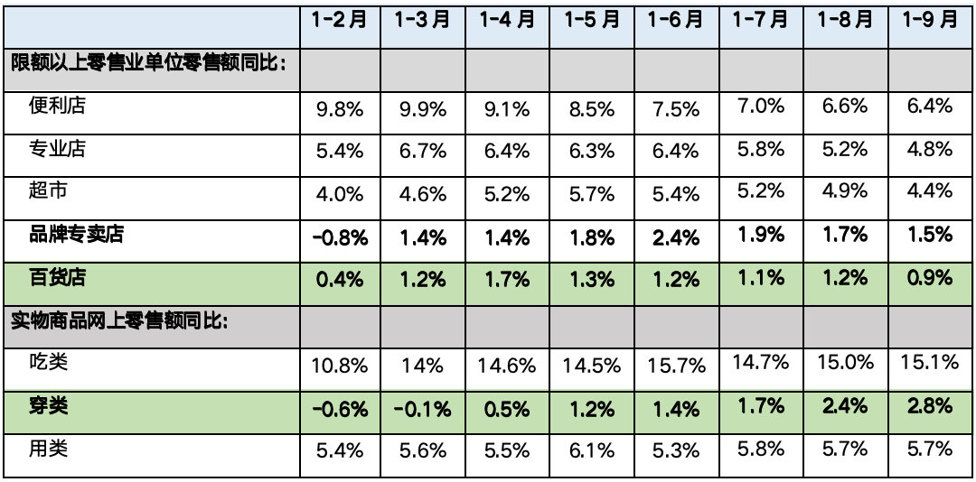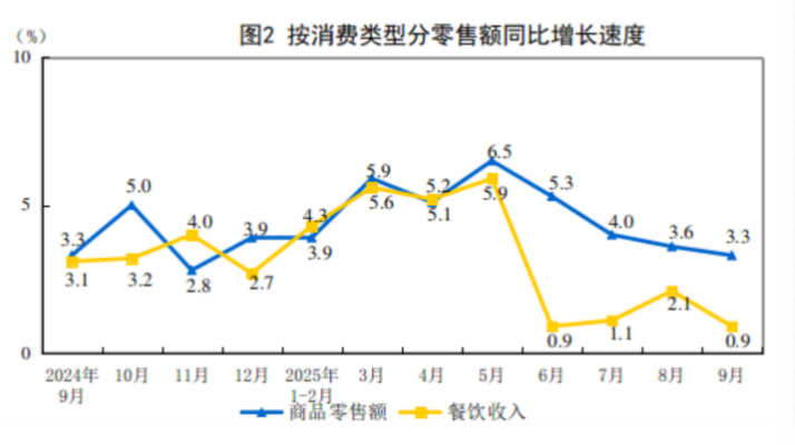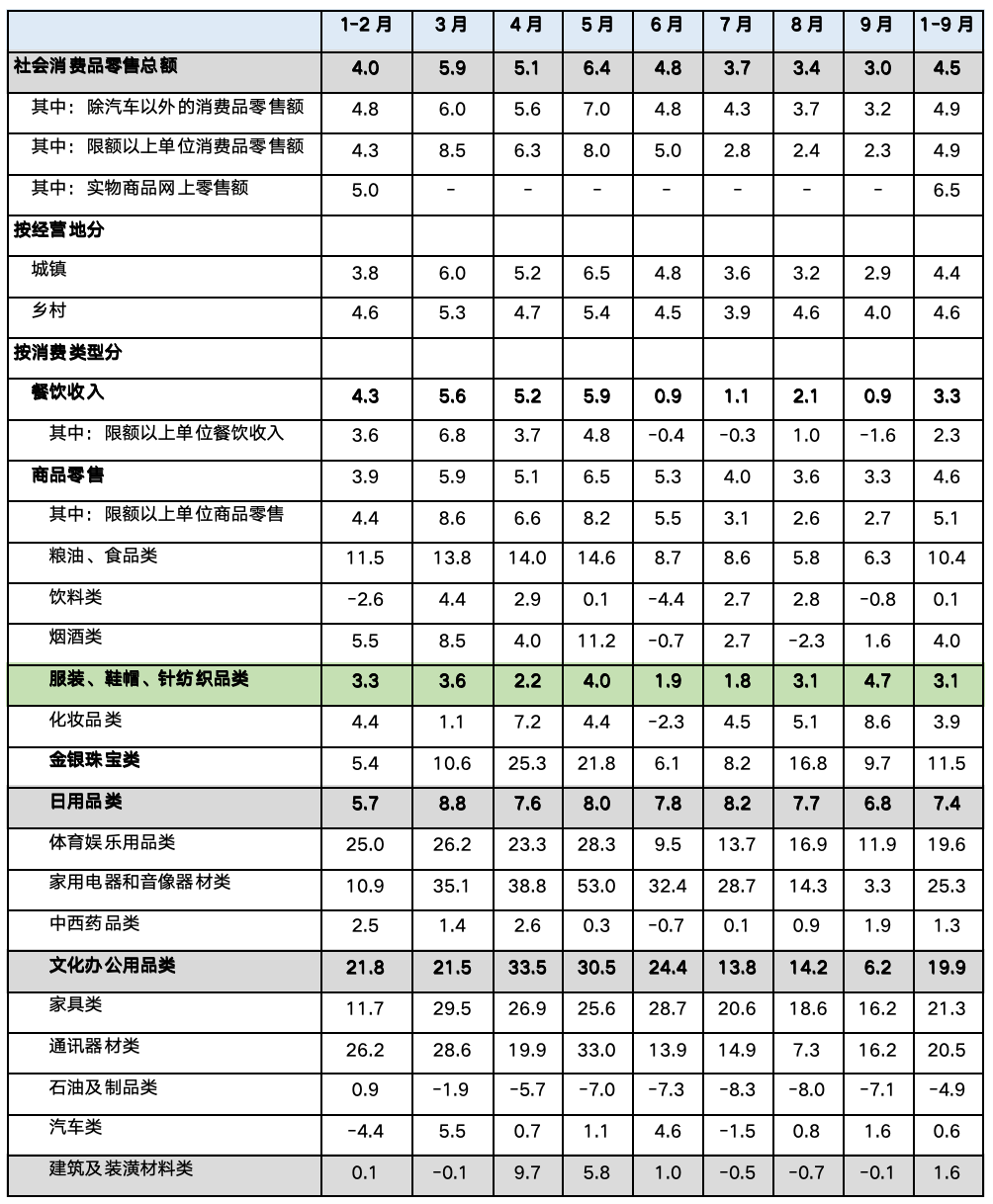 按消费类型分,9月份,商品零售同比增长3.3%,餐饮收入同比增长0.9%;服装、鞋帽、针纺织品零售额同比增长4.7%。