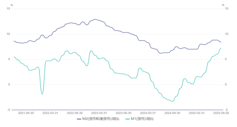9月末M1增速同比7.2%(新口径,包括居民活期存款),9月份M1单月增加1.92万亿元,相比去年同期多增1.35万亿元,主要原因有:9 月份财政“多支少收”,财政资金继续向居民和企业部门转移;由于三季度股市持续回暖,居民部门交易性需求增加,存款进一步活化。M2增速同比8.4%,较上月回落0.4个百分点。