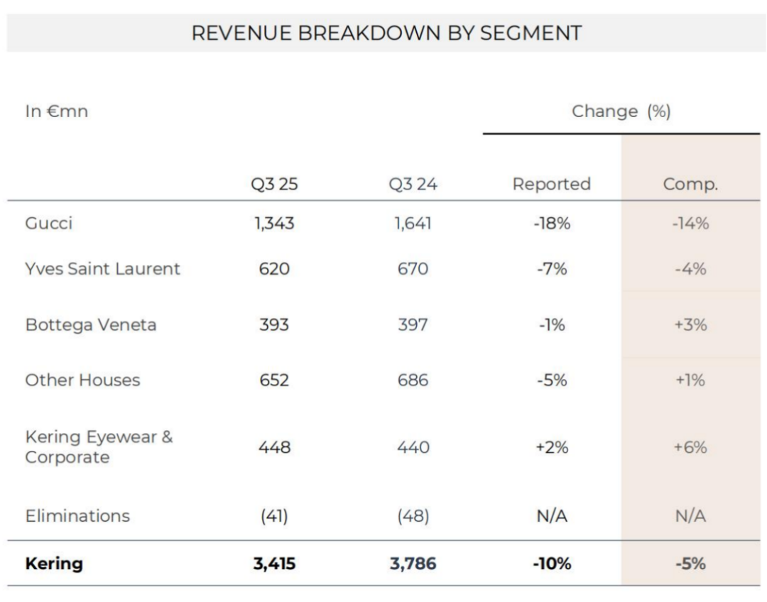 ● 开云集团:第三季度营收在可比基础上同比下降5%,较二季度降幅收窄10个百分点, Gucci下降14%;中国所在的亚太市场下降10%,较二季度降幅收窄9个百分点