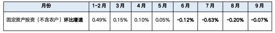 (2)投资:1-9月份固定资产投资同比下降0.5%