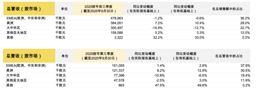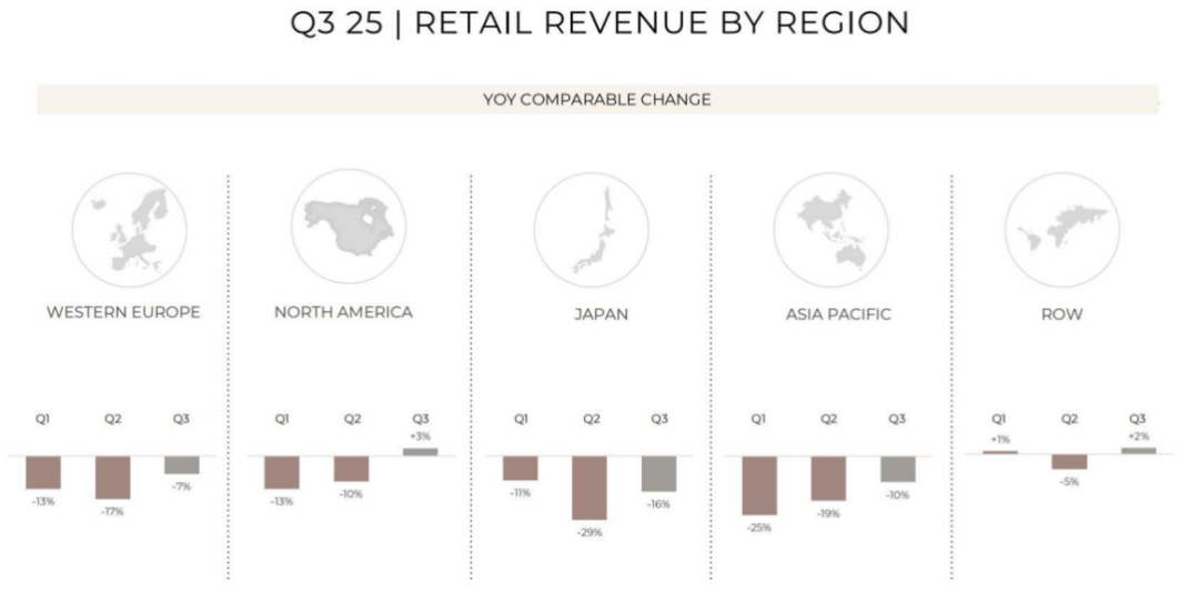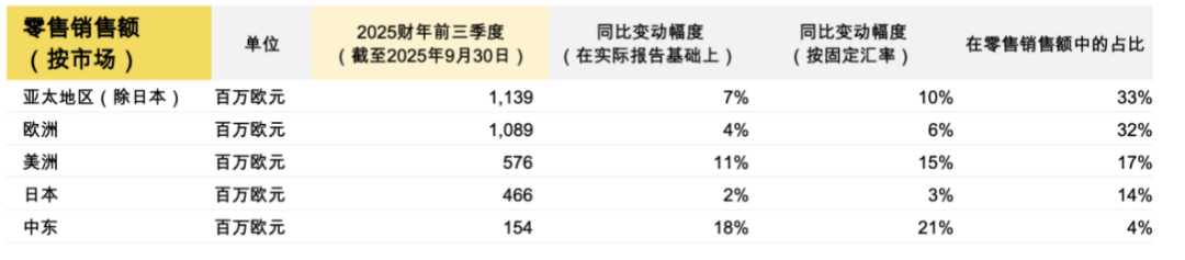 就第三季度而言,管理层在电话会议上表示,几乎所有主要地区的趋势均出现改善。美国和亚洲(不含日本)在第三季度重新实现正增长,中国市场在第三季度也实现了正增长。日本也显著改善,尽管基数仍然较高,但挑战较上半年有所缓和。欧洲总体保持稳定,由于游客消费下降、以及汇率波动影响较年初更为显著,营收受到一定压力。