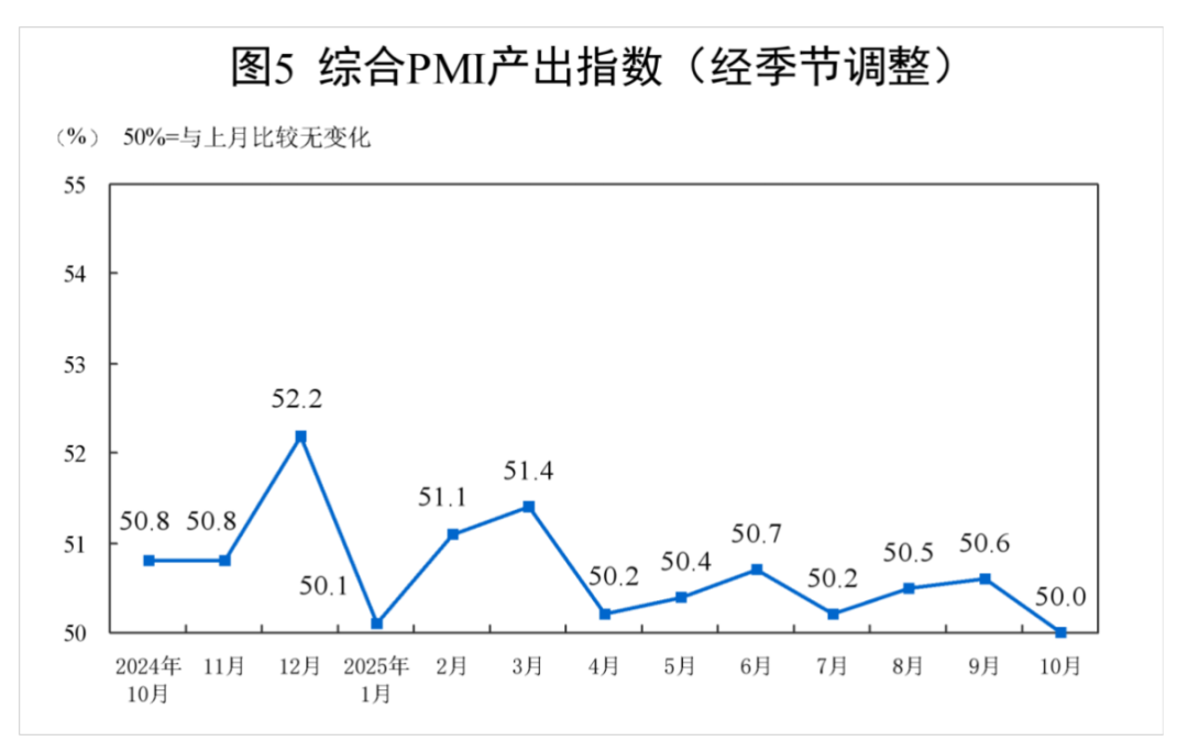 10月份综合PMI产出指数较上月下降0.6个百分点至50.0%