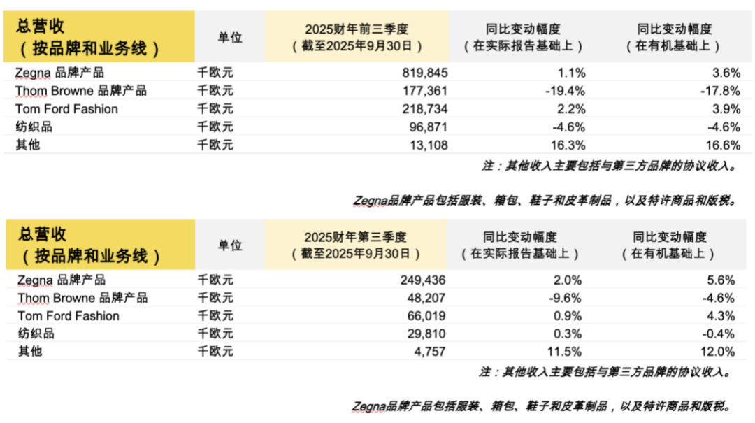 截至9月30日,杰尼亚集团2025财年前9个月及第三季度关键财务数据如下: