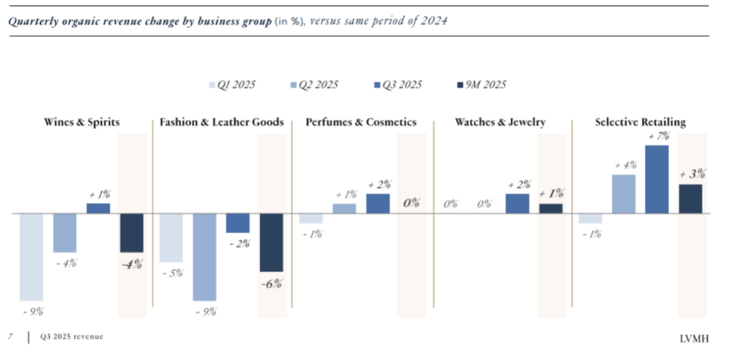 LVMH(路威酩轩)截至9月30日的2025财年前九个月业绩报告显示:总营收同比下降4%至580.9亿欧元(在有机基础上:-2%),其中第三季度总营收在有机基础上同比增长1%,各业务部门及各地区均出现回升,唯独欧洲例外(欧洲前三季度营收同比持平,第三季度则下降2%)。