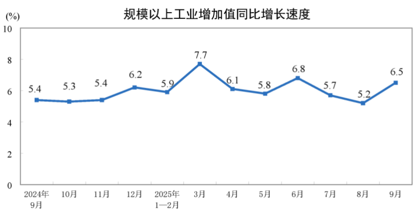 供给侧:9月份规模以上工业增加值同比增长6.5%,较8月份加快1.3个百分点