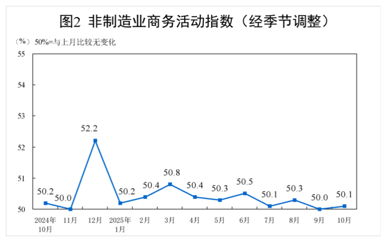10月份非制造业商务活动指数较上月微升0.1个百分点至50.1%