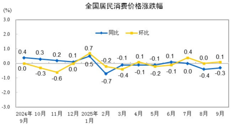 (1)9月份CPI同比下降0.3%,环比微升0.1%