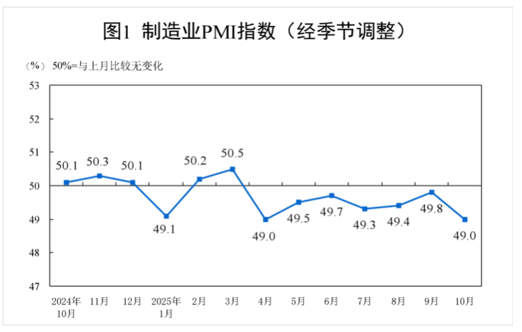 ● 10月份制造业PMI回落至49%,非制造业商务活动指数小幅回升至50.1%