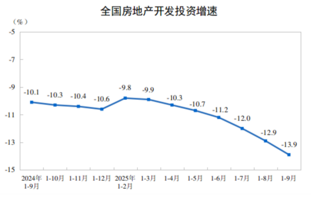 分领域来看,1-9月份,制造业投资同比增长4.0%(前值增长5.1%),基础设施投资(不含电力、热力、燃气及水生产和供应业)同比增长1.1%(前值增长2.0%),房地产开发投资同比下降13.9%(前值下降12.9%),住宅投资下降12.9%(前值下降11.9%)。