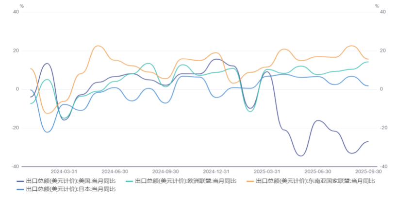 9月份,我国对东盟出口总额同比增长15.6%,对欧盟出口总额同比增长14.2%,对美国出口总额同比下降27%。美国关税政策依然给我国出口贸易带来较大不确定性。