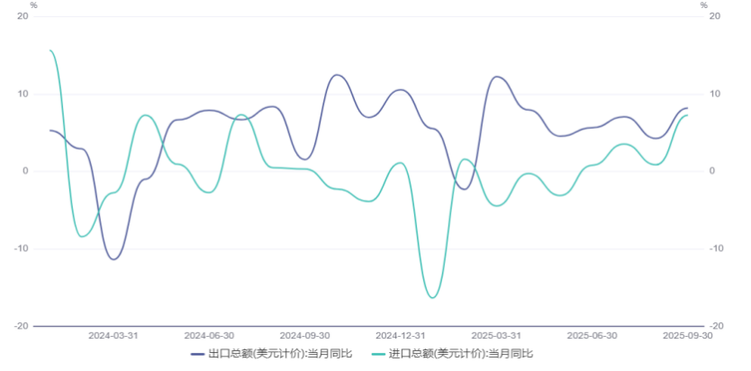 9月份,按美元计(下同),出口同比增长8.2%(前值增长4.4%);进口同比增长7.3%(前值增长1.3%)。