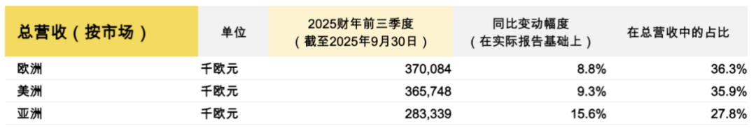 按市场划分,欧洲、中东和非洲(EMEA)市场领跑,同比增长 18.7%至2.468亿欧元,日本(+27.6%)和美国市场(+31.2%)也表现出色。然而,亚洲其他市场销售额同比下滑13.8%至1.93 亿欧元。