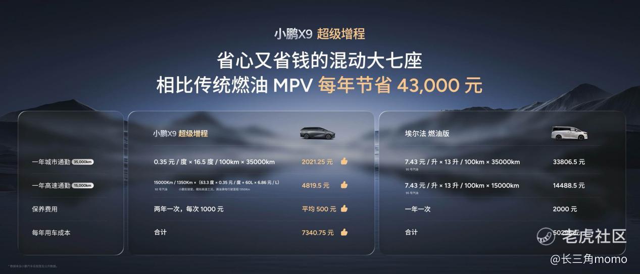 相比传统燃油MPV,X9增程版每年的电费、油费等用车成本,能节省约4.3万元;以上这些均依托于小鹏的全新一代增程技术——鲲鹏超级增程,拥有14项全球领先技术,200+项全系标配功能。