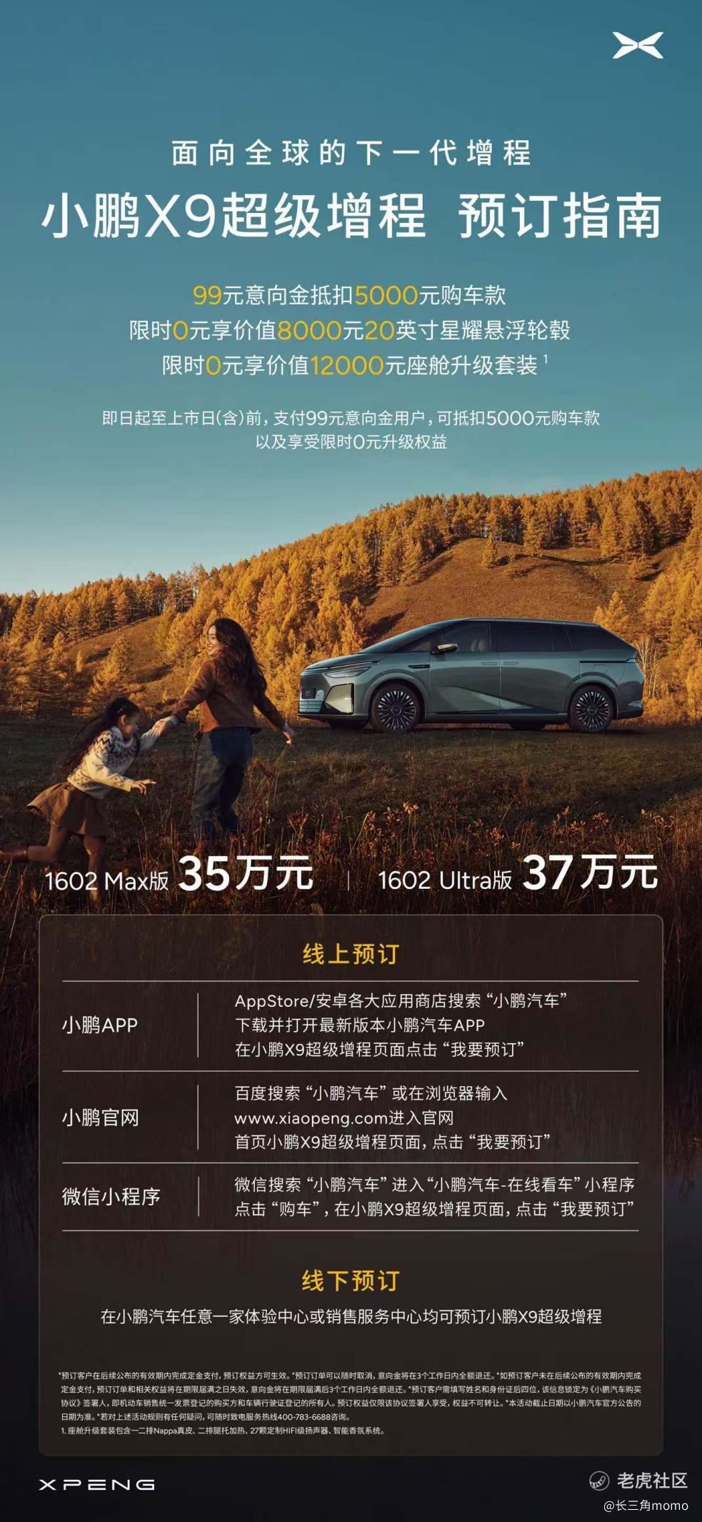 11月6日晚,小鹏X9增程版正式开启预售,共推出两个版本,分别是Max版,预售价35万元起;Ultra版,预售价37万元起。即日起至新车上市,预订可享多重优惠(见下图)。