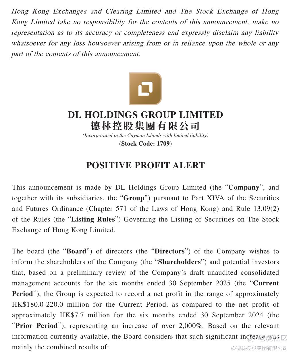 Hong Kong, November 9, 2025 — DL Holdings Group Limited (Stock Code: 1709.HK) today issued a positive profit alert, announcing that based on a preliminary review of the Group’s unaudited management accounts for the six months ended September 30, 2025. It is expected to record a profit of approximately HK$180 million to HK$220 million, compared with a net profit of about HK$7.7 million for the same period last year — representing an increase of over 20 times (approximately 2,107%–2,757%), far exceeding market expectations.