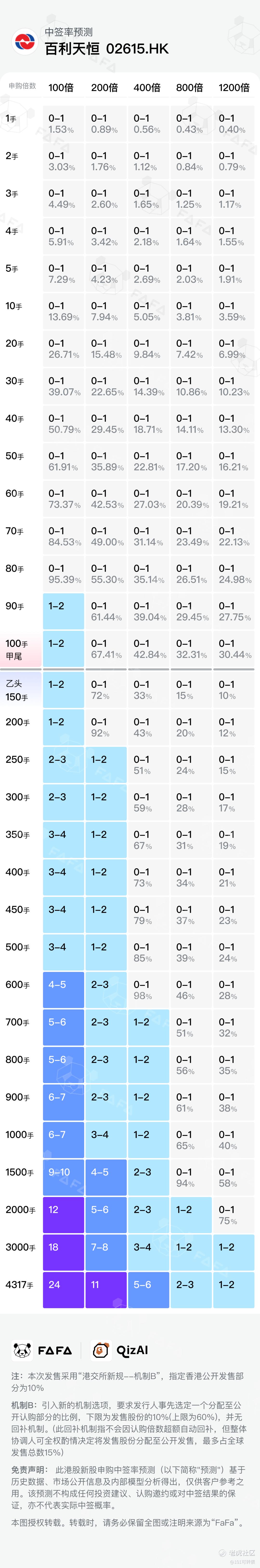 百利天恒此次采用机制B,回拨10%;全球发售863.43万股,香港公开发售86.35万股,每手100股,共计8635手。现在热度不到10倍,为什么呢?一方面是入场费高,其次最重要的还是怕破发,因为是二婚股,有之前二婚股破发的情绪在,打新是为了赚钱啦,而不是送钱,最终孖展预计是30倍左右。由高盛、摩根大通、中信保荐,业绩还行;无绿鞋,有基石,占比约7.81%。