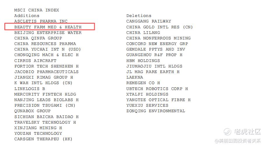11月6日,国际指数编制公司MSCI公布了其11月份的指数变更结果,宣布将美丽田园医疗健康(股票代码:02373.HK)等22只个股纳入MSCI全球小盘股指数,该调整将于11月24日收盘后正式生效。