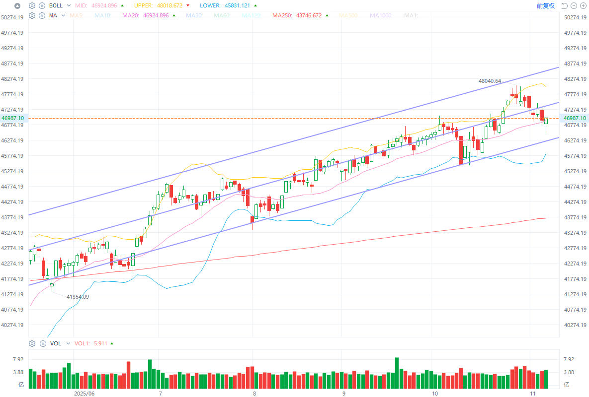 $道琼斯(.DJI)$ 目前徘徊在47,000点附近,短期支撑可关注46,800点心理关口,下方为年内低点附近,阻力在48,000点附近的重要整数位。综合看,技术面短线存在一定分歧,机构普遍认为目前类似“震荡筑底”而非趋势性逆转,只要主要支撑位守住,多头趋势仍具备延续可能。市场关注下周是否能有效收复关键均线,以及12月美联储决议前的走势方向。