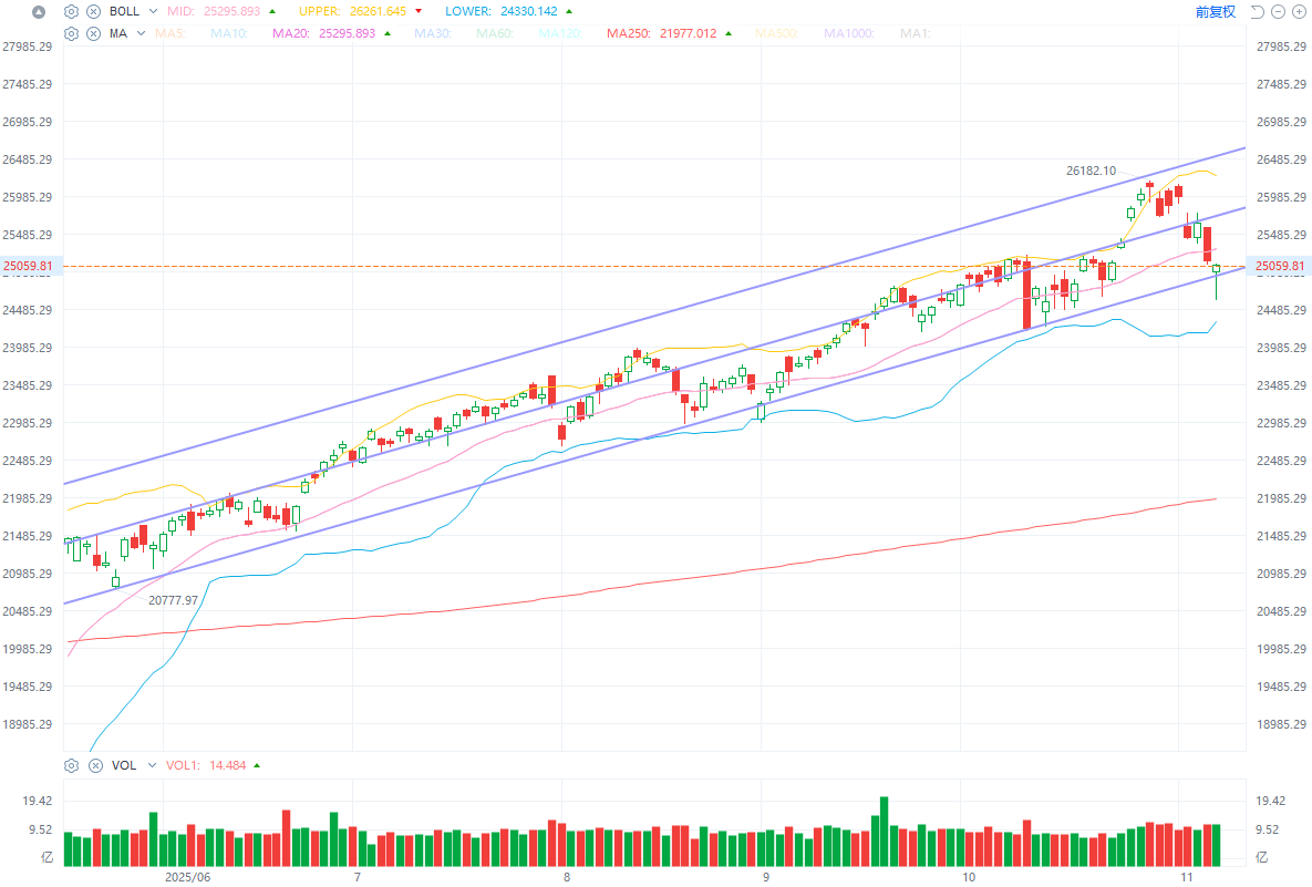 $纳斯达克100指数(NDX)$ 近期回调至约50%斐波那契回撤位约24635点,IG分析指出关键支撑在约23,000点。若守住此位,则有望反弹;否则回调空间将大幅拓展,下方可能检验今年低点。反弹阻力可见于25,500点附近。